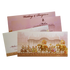 This boxed wedding card features a beautiful beige background with an embossed royal elephant procession or baarat, ornate palace artwork, and delicate gold detailing. Complete with 2 colorful inserts, it's ideal for adding a regal touch to your wedding celebration.