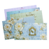 This luxurious blue wedding invitation features beautifully embossed floral designs with gold detailing and an ornate golden crest for initials. Includes 3 elegant inserts and a coordinated bag handled envelope, making it perfect for grand and stylish celebrations.