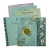 This Blue padded wedding card adorned with elegant floral artwork, metallic gold highlights, and a unique geometric gold nameplate. The invitation showcases a smooth green background and stylish floral side panel, perfect for modern yet classic weddings. Includes matching envelope and 3 inserts for a premium invitation set.