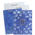 This blue double door wedding card features elegant silver floral patterns and a contemporary gold monogram emblem,Acrylic nameplate in the center. The unique blend of metallic accents and floral artistry creates a modern, luxurious invitation for stylish weddings. Includes a matching envelope and 2 inserts for a complete, premium invitation suite.