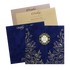 This blue gold floral padded wedding card features a rich blue hardbound padded cover adorned with embossed gold floral motifs and an elegant ornate gold nameplate. The luxurious color combination and intricate detailing create an exquisite invitation perfect for upscale wedding celebrations. Includes a matching envelope and 2 inserts for a complete premium set.