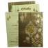 This luxurious padded wedding card features a rich brown base with intricate gold foil floral patterns and elegant hanging motifs. It features plush, padded door style opening with the ornate crest and an acrylic nameplate at the center along with 2 colorful inserts and a green shimmery envelope.