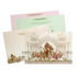 This cream padded wedding card showcases a lively 3D baraat procession featuring regal elephants, musicians, and dancers, set against a beautifully embossed palace backdrop. The card boasts intricate embossing with gold accents and a luxurious hardbound padded cover, ideal for elegant wedding celebrations. The set includes a matching envelope and two colorful inserts for a complete wedding package.