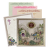 This cream padded wedding card showcases an intricately adorned blue elephant in a palace setting with ornate gazebos, blush foliage, and regal artistic accents and wooden nameplate. Includes envelope and inserts..