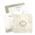 This Cream gold floral embossed padded wedding card features a luxurious hardbound cover adorned with delicate gold floral motifs and a decorative acrylic gold foil. The elegant design and premium embossing add refined charm, perfect for opulent wedding invitations. Each set includes a matching envelope and 2 inserts for a complete ensemble.