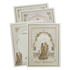 This luxurious padded wedding card features detailed laser cut floral arches on a cream base, with an elegant couple in traditional attire set against a regal palace backdrop. The rich embossing and ornate frame add opulence, making it perfect for grand celebrations. Includes envelope and themed 2 inserts.