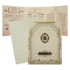 This elegant wedding card features a palace-inspired arched jaali design in cream, with ornate columns and embossed details. The cream base is embellished with floral artwork in soft yellows, beige, and greens, complemented by a gold rope handle and a regal gold nameplate.Set includes envelope and inserts.