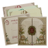 This Elegant cream padded wedding card with grand palace arches, twin peacocks, and blush floral accents,ornate wooden nameplate. Includes envelope and 3 inserts.