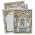 This green and gold padded wedding card showcases a 3D embossed palace pavilion with Radha Krishna divine artwork in vibrant hues, set against blush green detailing and metallic gold highlights. Ornate royal pillars, floral elements, and serene water features complete the luxurious invitation, perfect for traditional premium wedding celebrations. Each set includes a matching envelope and 2 inserts for a complete invitation package.