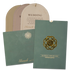 This green gold tassel monogram wedding card features a unique gold tassel nameplate with a monogram, set on a premium matte green invitation. The set includes inserts.