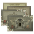 This grey padded wedding card with grand palace arch artwork, intricate pillar detailing, and twin gold-adorned elephants. Pastel floral clusters and hanging lantern and gold nameplate. Set includes envelope and inserts.