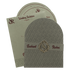 This grey taupe wedding card shaped as double door opened an elegant arch with intricate textured pattern, gold filigree cameo brooch and satin ribbon band with initials.Set includes envelope and 2 inserts.
