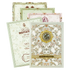 This ivory green floral wedding card showcasing an intricate cutout floral damask pattern with a radiant gold circular ganesha sticker framed by shimmering rose and green accents with gold nameplate.Set includes envelope and inserts.