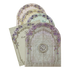 This light lavender wedding card designed as double door opened, an gold foiling arched with purple floral garlands, central wooden nameplate.Set includes envelope and 3 inserts.