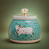 This light green decorative small jar featuring a playful white cow surrounded by pink lotus motifs on a lattice pattern, finished with a smooth white rim and a sparkling crystal knob lid for an elegant festive accent.