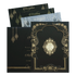 This elegant black wedding invitation card features a padded cover with intricate gold foil embossed floral designs and a striking central nameplate. The set includes a tracing sheet, 2 premium inserts, and a matching envelope—perfect for lavish and memorable celebrations.
