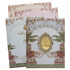 This mint green padded wedding card features intricate floral accents, ornate silver detailing, and majestic embossed elephants. Decorative leaves and an elaborate frame enhance its royal appearance, making it ideal for elegant traditional wedding themes. Each card includes a matching envelope and colorfu l2 inserts for all ceremonies.
