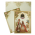 This mint green peacock couple wedding card showcases a finely dressed bride and groom framed by ornate floral arches, symbolizing elegance and celebration,and gold nameplate.Set includes envelope and inserts.