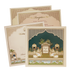 This palace-themed cream and blue padded wedding card, adorned with intricate royal arches, white cows, and swans for a traditional touch. The soft cream background and detailed golden accents blend heritage with luxury. Each card includes a matching envelope and two inserts, perfect for grand Indian weddings.
