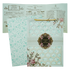 This elegant bag-style wedding card features a pastel blue base with intricate jaali cutwork overlay. Delicate floral patterns in soft pinks and greens decorate the corners, framed by a refined gold and pink center gold nameplate.Set includes envelope and inserts.