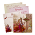 This Pastel brown padded wedding card featuring a divine Krishna and Radha artwork with opulent palace backdrops, floral accents, gold highlights, and peacock motifs. The design is complemented by an ornate wood nameplate, making this invitation an elegant choice for spiritual and traditional weddings. Includes matching envelope and 3 inserts for a complete set.