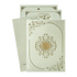This pastel green padded wedding card features intricately embossed gold floral patterns, fluted geometric borders, and a luxurious round gold nameplate at the center.Set includes envelope and inserts.