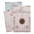 This beautiful wedding card features double door opened, a pastel pink base with delicate floral and leafy patterns framing an intricate palace illustration. An ornate gold-maroon center wooden nameplate adds an elegant touch.Set includes envelope and inserts.