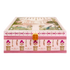 This pastel pink luxury box features elegant palace architecture and garden artwork, accented with floral urns and peacock details in gold foil for a truly regal look. The box includes 4 glass jars with matching pink and gold lids, nestled on soft satin making it ideal for gifting sweets or dry fruits at weddings and festive occasions.