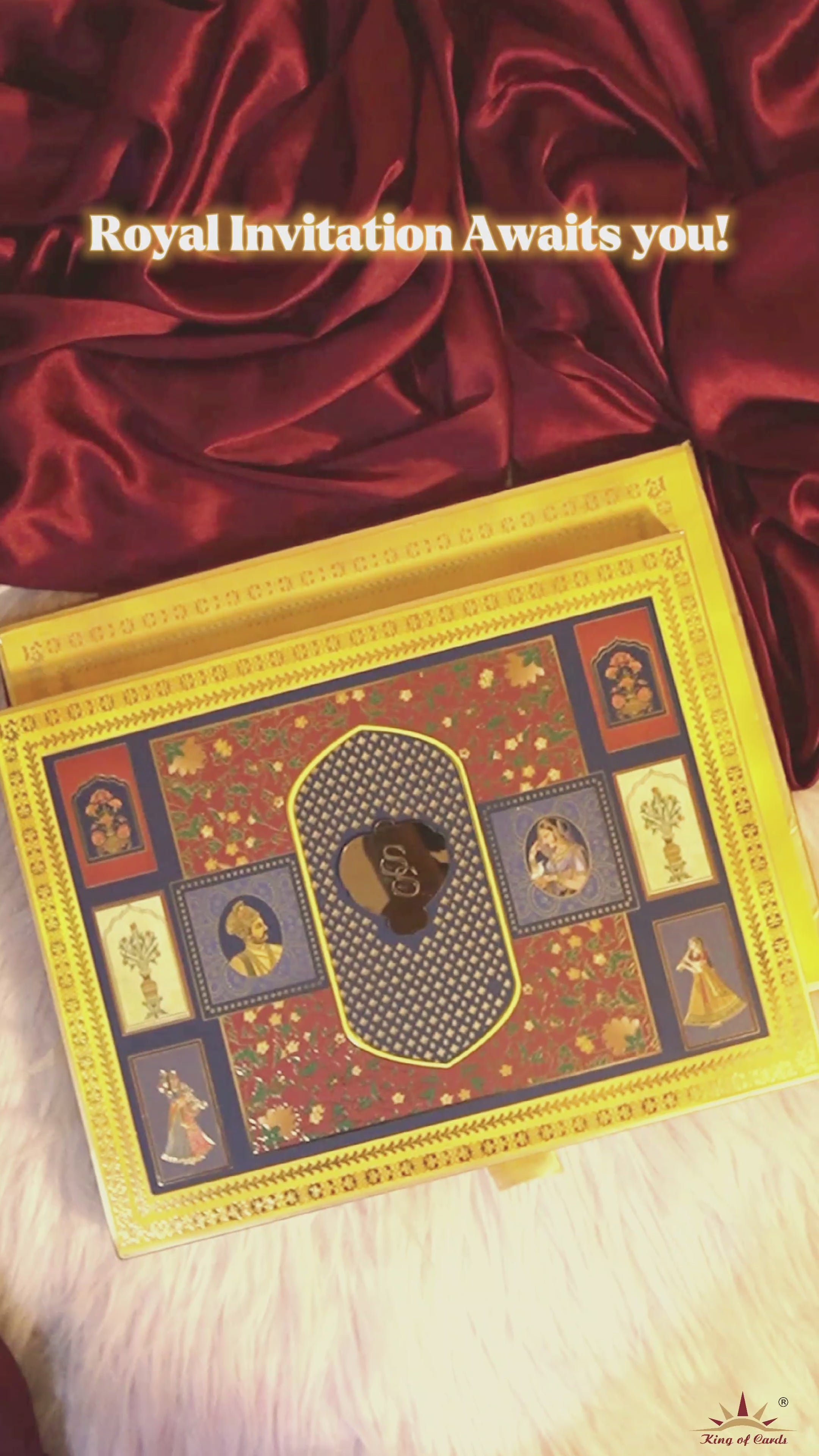 Pastel shades ivory wedding card has laser cut design on top with nature and acrylic nameplate. It includes three inserts and box envelope.