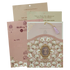 This luxurious wedding card features a soft pink base with elegant laser-cut patterns and detailed white floral motifs accented in gold. The ornate gold nameplate and delicate lavender tassel add a refined finishing touch.Set includes envelope and inserts.