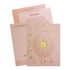 This pink and gold padded wedding card features an intricate round lasercut floral pattern with gold detailing, centered around a personalized elegant gold nameplate. The soft pastel pink base and elegant embossing make it ideal for contemporary luxury wedding invitations. Each set includes a matching envelope and 2 inserts for a complete invitation package.