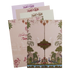 This Elegant pink padded wedding card with detailed palace domes, lush greenery,elegant ornate wooden nameplate and twin peacock motifs by the water. Includes envelope and 3 inserts.