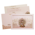 This pink padded wedding card features an enchanting Radha Krishna motif seated beneath a lush tree with a majestic palace backdrop. Surrounded by blooming lotus flowers and detailed palace architecture, the card blends tradition and luxury with its hardbound padded cover. The set includes a envelope and two inserts, perfect for spiritual and elegant celebrations.