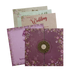 This Purple padded wedding card featuring elegant embossed floral artwork in pastel tones and delicate gold highlights. The central circular wood nameplate and premium textured finish give the invitation a refined, luxurious feel, perfect for sophisticated celebrations. Includes matching envelope and 3 inserts for a complete set.