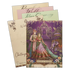 This purple padded wedding card features an ornate palace backdrop, a royal bride and groom, an artistically adorned elephant, and vibrant gold accents,wooden nameplate. Set includes envelope and inserts.