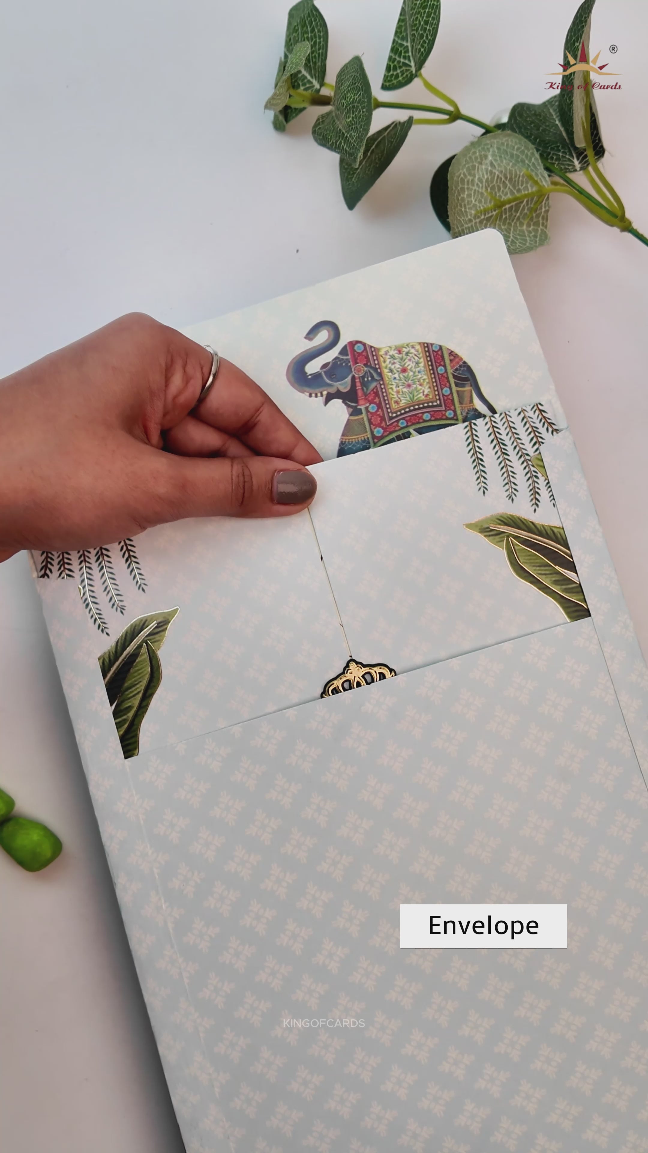 This Regal Blue Elephant Gatefold Wedding Card, featuring vibrant blue accents, traditional domed arches, and richly decorated royal elephants, gold emblem nameplate.Set includes envelope and inserts.