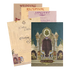 This royal palace themed padded wedding card features a grand entrance, ornate columns, majestic elephants, and festive musicians. The inspiring Ganesha motif and elegant wooden nameplate create a magnificent atmosphere for traditional celebrations. Set includes envelope and inserts.