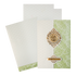 This two-tone white and green wedding card featuring an embossed pattern, floral background, and a central golden Ganesha sticker with a personalized detail strip.Set includes envelope and inserts.