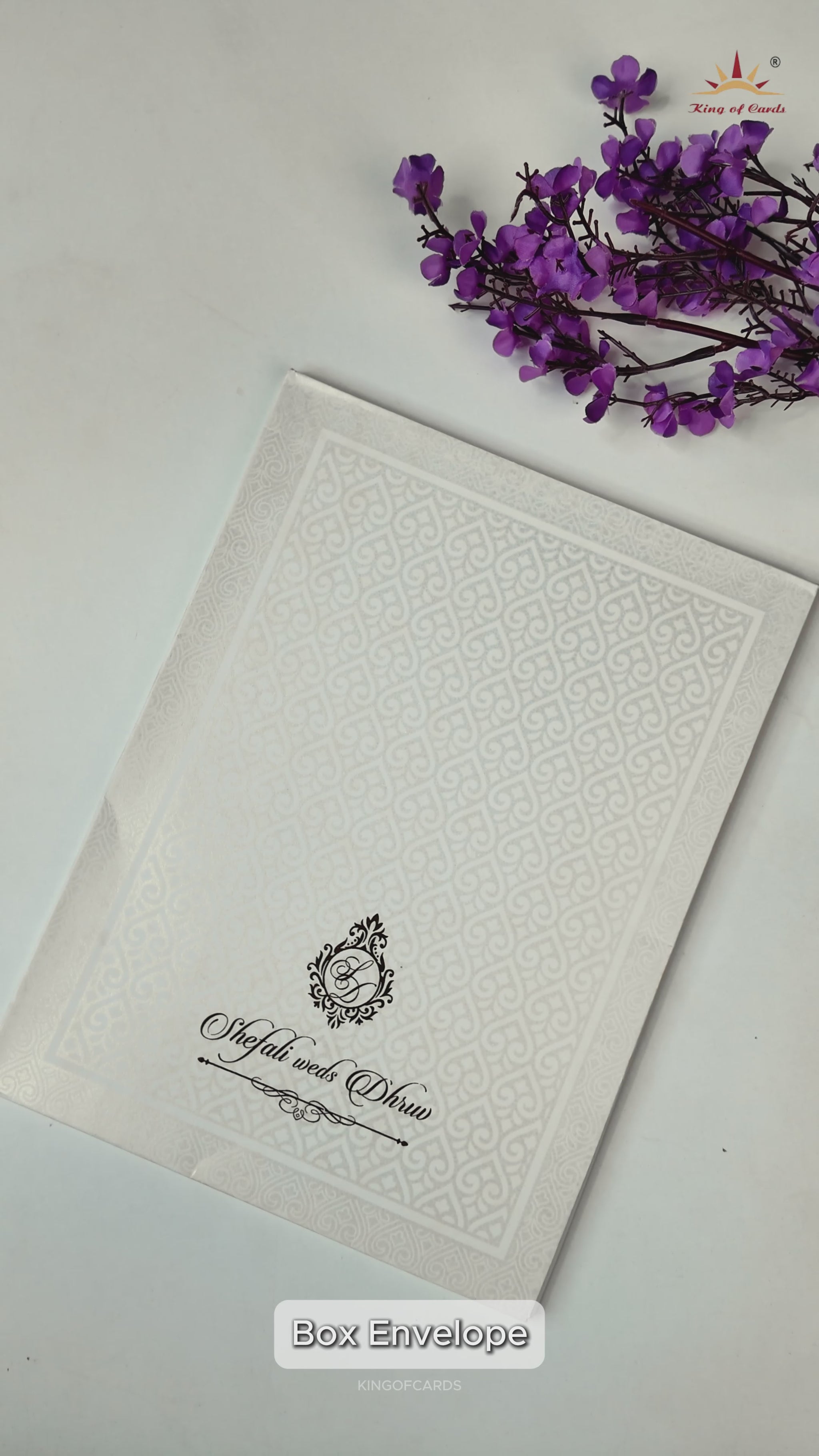 This white wedding card features an embossed floral with Ganesha sticker, ornate wooden nameplate and refined textures throughout.Set includes envelope and inserts.