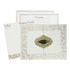 This White padded wedding card with embossed gold floral motifs and ornate central gold nameplate. Modern luxury invitation for classic celebrations. Set includes envelope and inserts.