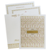 This White laser cut padded floral modern square wedding card featuring detailed laser cut embossing with gold highlights and a modern floral monogram and gold nameplate. The plush padded finish provides a luxurious and elegant look, perfect for upscale weddings. Includes envelope and 2 inserts