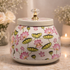 This white decorative small jar richly patterned with pink lotus flowers and green lotus leaves all around, topped with a smooth white rim and a sparkling crystal knob lid for a refined festive accent.