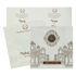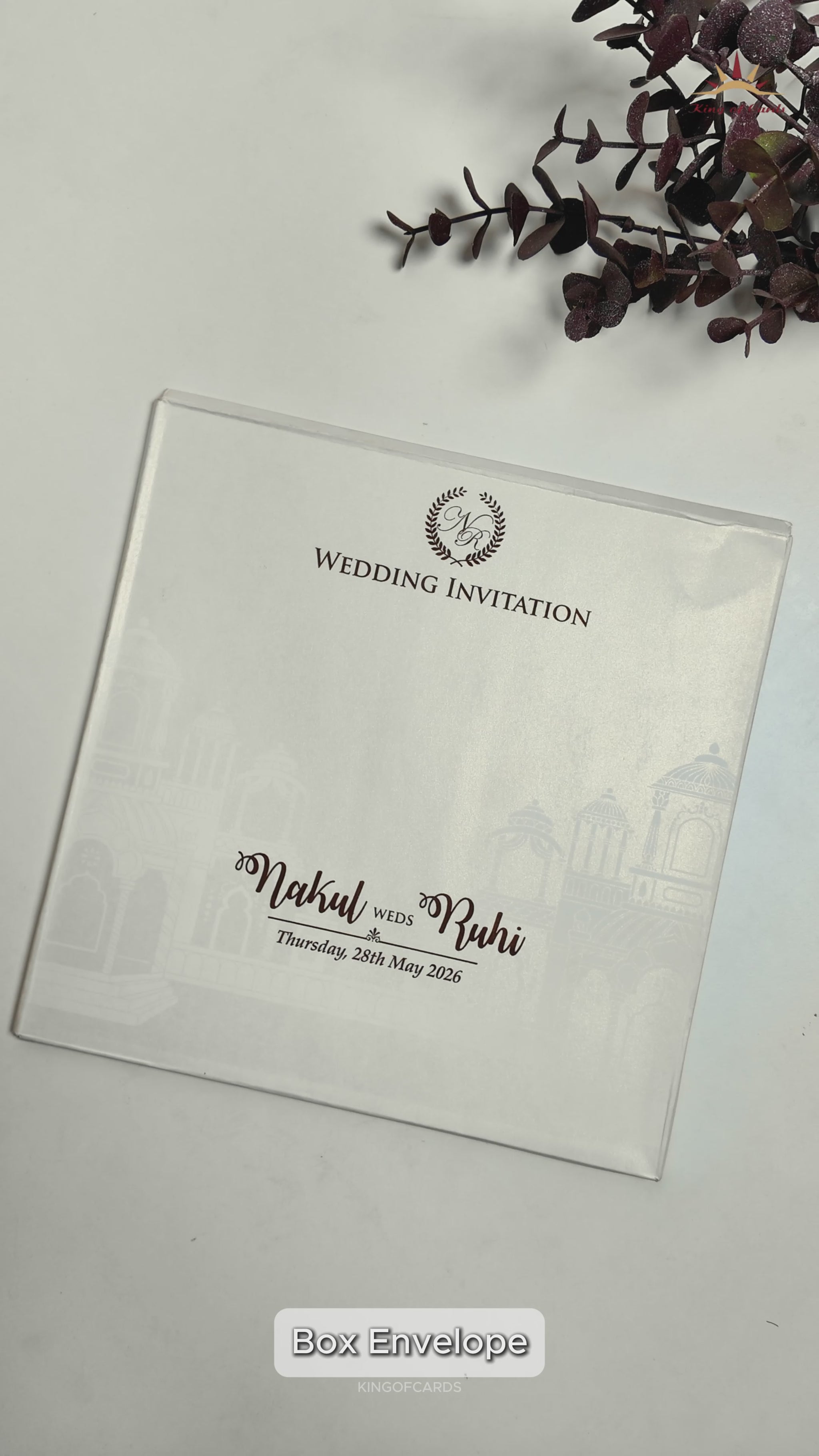 This white wedding card spotlights grand Indian palace architecture in embossed artwork, a classic Ganesh sticker centerpiece, and a wooden nameplate for luxury appeal.Set includes envelope and inaerts.